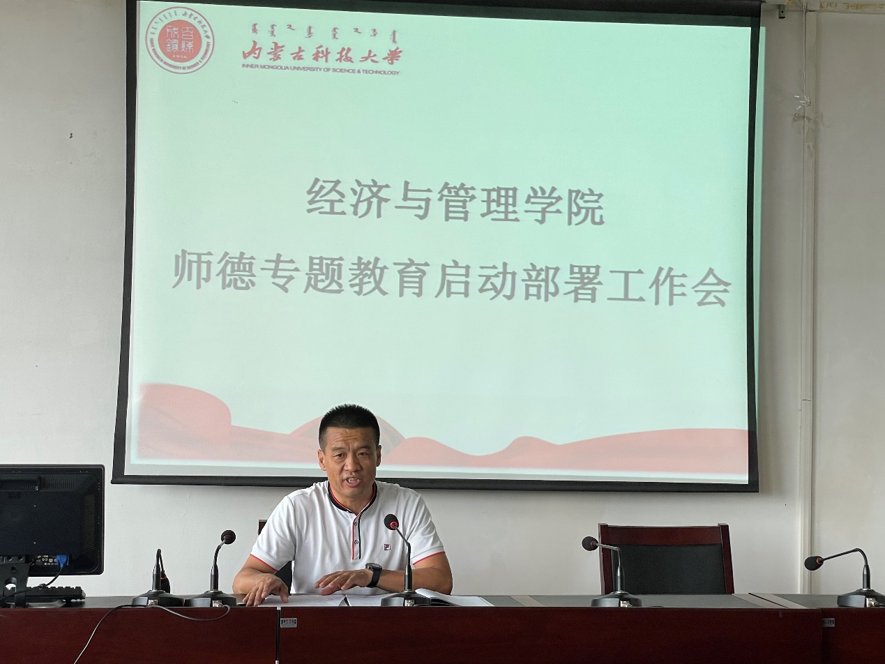 2021年6月28日上午,经济与管理公司党委在腾飞楼A413召开师德专题教育启动部署工作会。党委书记王玉泉主持会议并讲话,公司在校教职工参加了此次会议。公司严格落实《内蒙古自治区教育厅关于在全区教育系统开展师德专题教育的通知》(内教教师函[2021]44号)通知精神,在全院范围内开展师德专题教育。