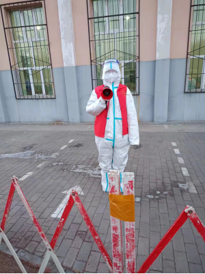 20级金融学马轩轩,在五一期间,在社区参加抗疫志愿服务工作。她需要在凌晨4点起身前往核酸检测点,匆忙吃完早点和穿好防护服。6点钟,居民陆续来到核酸检测点。她在旁边拿着大喇叭喊着:“大家保持距离都站在一米线上!”“提前准备好健康码,没有健康码的拿好身份证!”在做核酸检测的过程中,虽然有一些居民并没有那么配合,会插队,没有保持一米间距,但大部分居民还是非常配合的。在居民的配合下完成了每一次核酸检测。