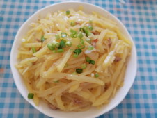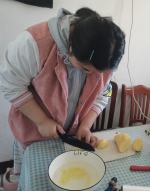 她的体验是先熟练地在电饭煲里闷上了饭,然后就开始准备土豆丝和豆角。刀工特别差,土豆丝切得很慢。土豆因为有淀粉容易粘锅,所以不停地翻动也不是一个省力的活。饭后,刷了碗,还打扫了厨房,今天做饭一顿忙,把厨房搞得一团糟,洗碗时候的工程量就非常大了。
