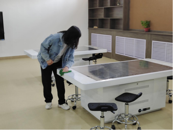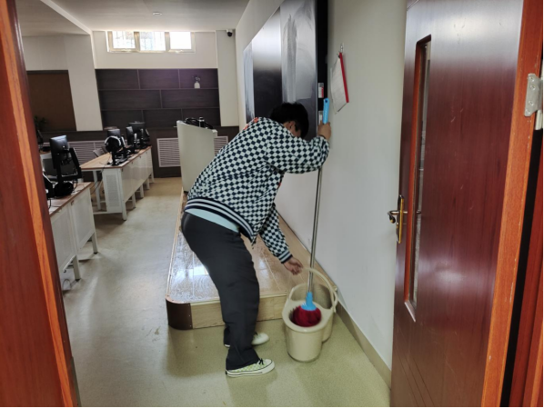 本次活动主要内容是参观了解并对实验教学中心进行义务清扫和整理。良好的环境卫生是大家学习的重要保障。活动中,党员和积极分子分工协作,拿起扫把、拖把和抹布等工具,清扫楼道和实验室,大家仔细擦洗了楼道内的扶手、实验室内外门窗、桌子、电脑设备、多功能黑板、书架等容易积尘处,拖洗每个机房室的地面和楼道楼梯,确保不留死角。大家干劲十足,充分发挥团结协作精神,场面热火朝天,清洁后的实验教学中心焕然一新。