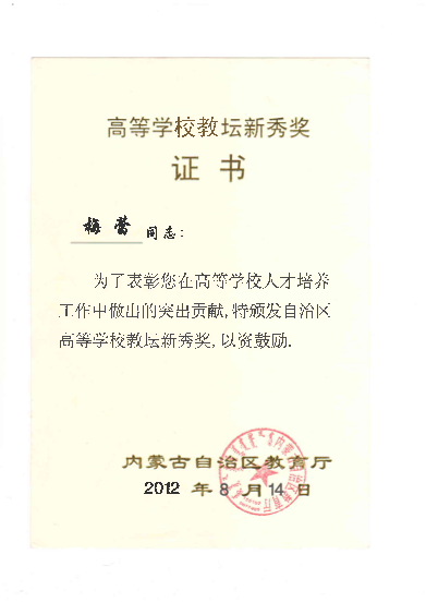 教学教改方面荣获各类奖项13项。主要包括:2012年内蒙古自治区第二届高等公司教坛新秀奖。2012年度包头市优秀教师。2005年fun88乐天使第一届“教学优秀奖”,2009年fun88乐天使第二届“教学优秀奖”,2011年fun88乐天使第三届“教学优秀奖”。2006年校级教学成果奖一等奖1项,2009年校级教学成果奖二等奖2项,2015年校级教学成果奖二等奖1项。