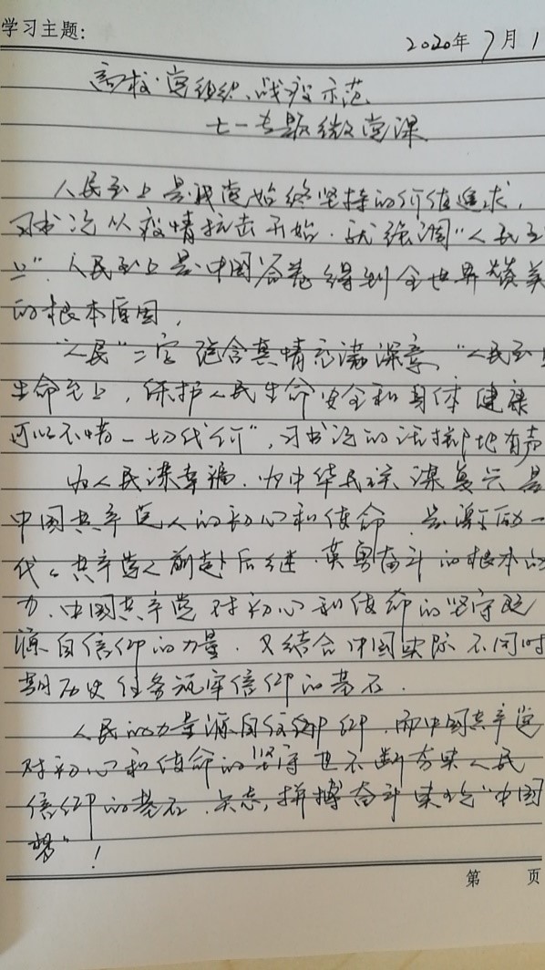 员工一支部吴百灵:在建党99年里,我们党一直在拼搏、发展,遇到过很多的挫折与磨难,但从没有被打败。就比如今年的疫情,我们国家本着人民至上的精神基本控制住了疫情。作为一名预备党员,我要坚定理想信念,加强自己的理论学习,以更高的要求来要求自己,为党的事业、建设中国特色社会主义而奋斗。