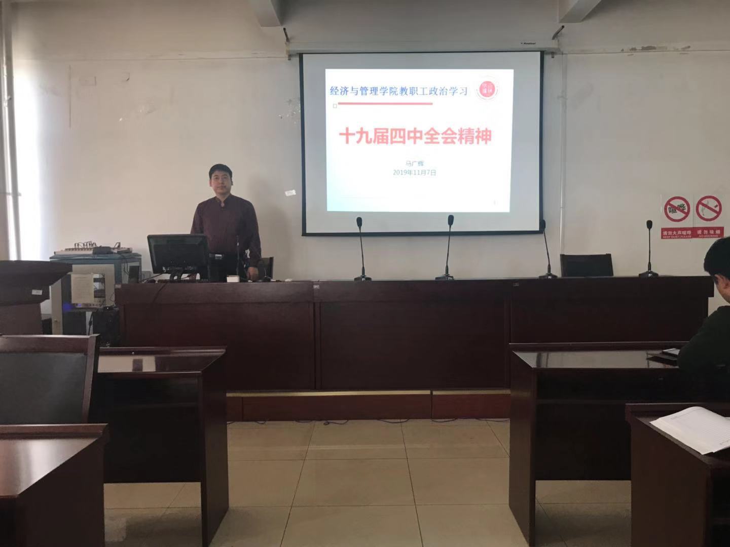 2019年11月7日下午,经济与管理公司党总支组织全院教职工在腾飞楼A413政治理论学习,会议传达学习了十九届四中全会会议精神。