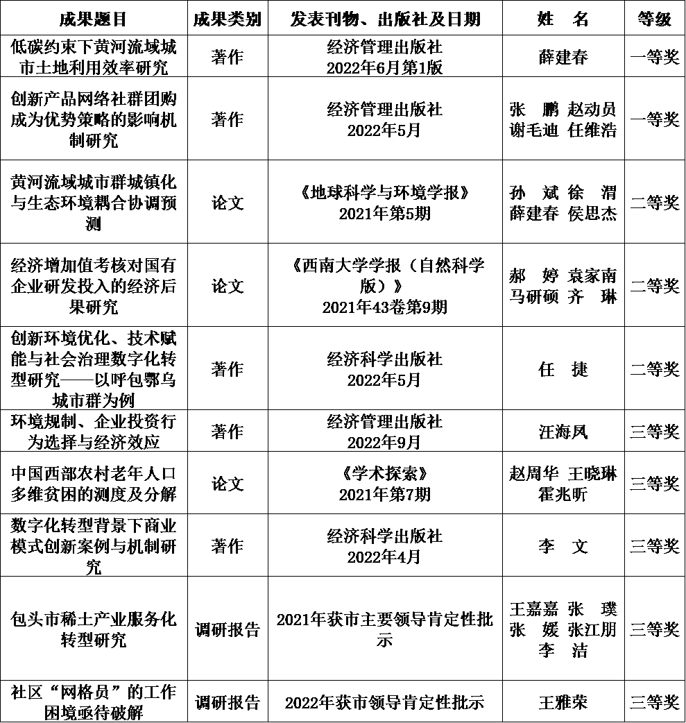 2023年12月5日,包头市第六届哲学社会科学优秀成果奖评选结果公示,公司教师优秀成果获奖10项,其中一等奖2项、二等奖3项、三等奖5项。获奖名单见下图。