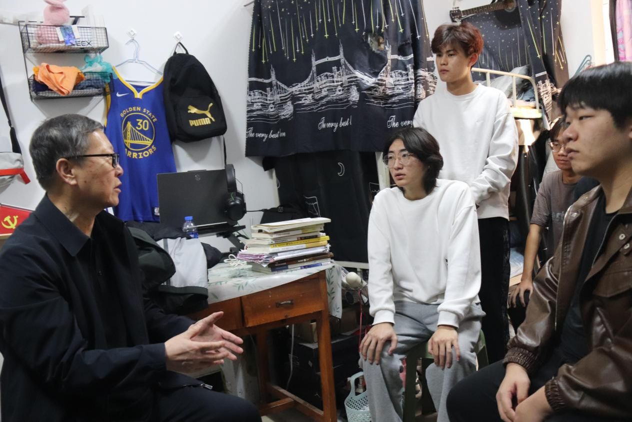 “家是哪里的?”“在公司吃得习惯吗?”“最近有没有看什么书?”杨建林走进23号楼127室,与同学们面对面亲切交流。他详细询问了同学们的学习生活情况,特别关注了大家在校的学习状态和身心健康。同时鼓励同学们规划好学习生活,主动学习使用新技术,多阅读课外书籍,关注校园和社会热点,增强安全防范意识。