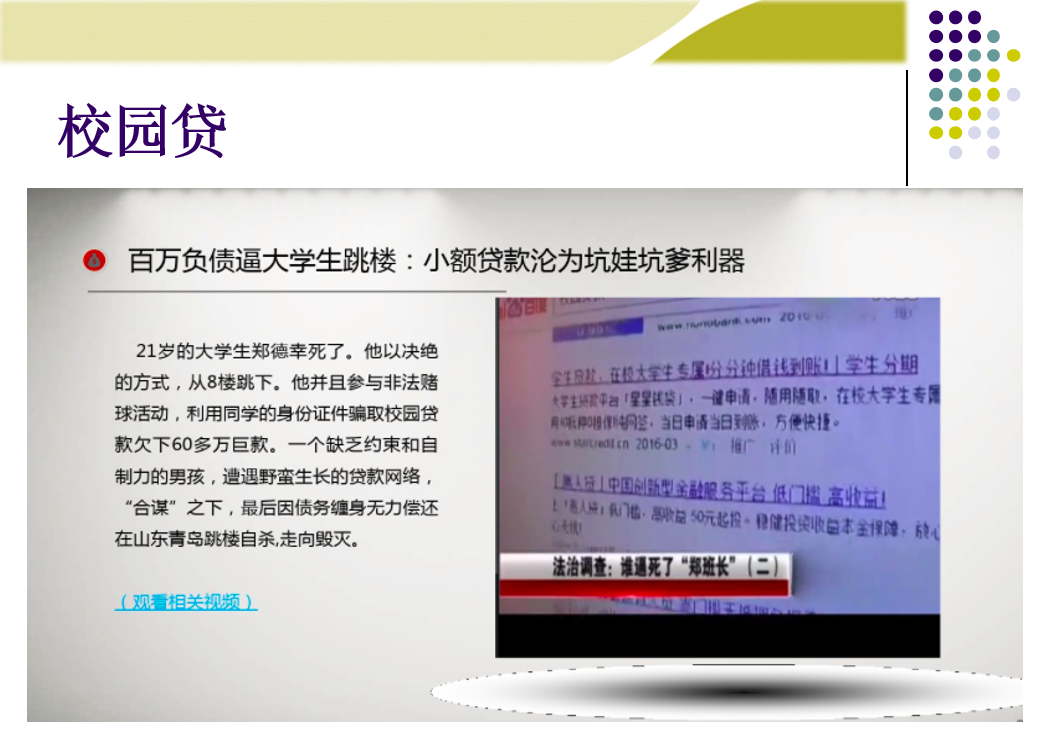 5.案例的基本情况:近些年“校园贷”问题频频出现在媒体曝光当中,引起了全社会的广泛关注。2016年4月,教育部与银监会联合发布了《关于加强校园不良网络借贷风险防范和教育引导工作的通知》,明确要求各高校建立校园不良网络借贷日常监测机制和实时预警机制,同时,建立校园不良网络借贷应对处置机制。2016年8月,银监会亦明确提出“停、移、整、教、引”五字方针,整改校园贷。2017年9月,教育部发布明确“取缔校园贷业务”,任何网络贷款机构都不允许向在校老员工发放贷款。即便如此,校园贷问题在过去的几年中屡禁不止,成为损害员工身心健康及所在家庭利益的刽子手。