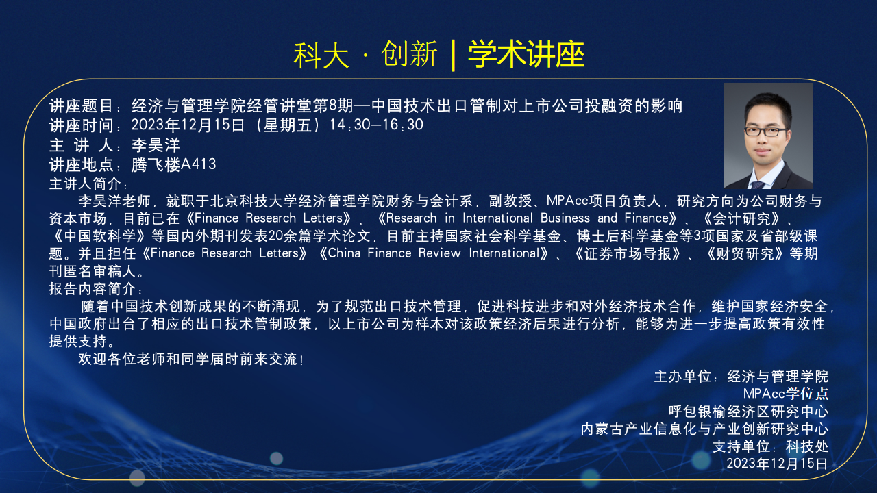 讲座题目:乐天使经管讲堂第8期—中国技术出口管制对上市公司投融资的影响